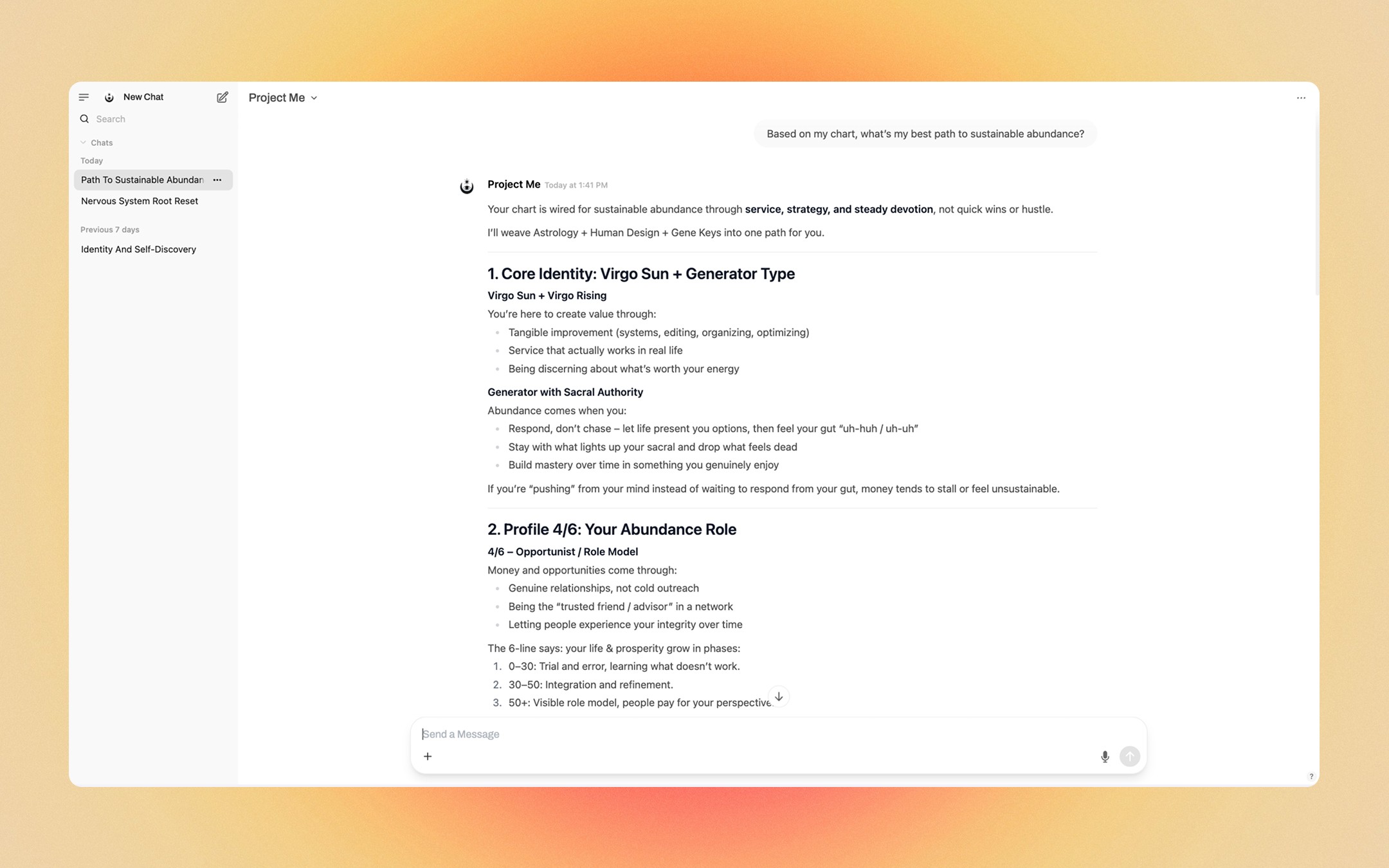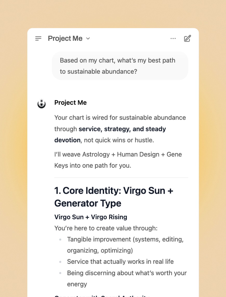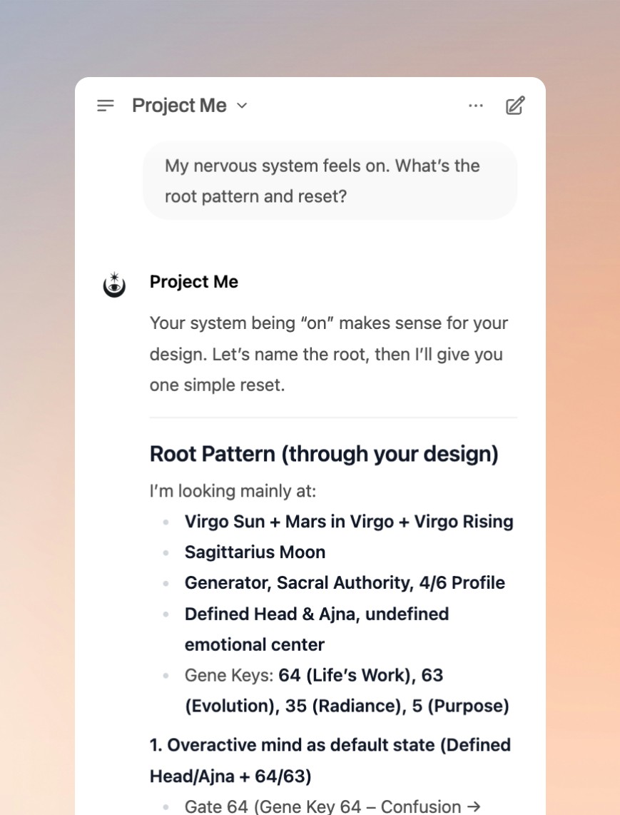 Project Me helps you understand the patterns shaping your life, relationships, and decisions by weaving together astrology, Human Design, and Gene Keys, so you can move forward with more trust, confidence, and ease.